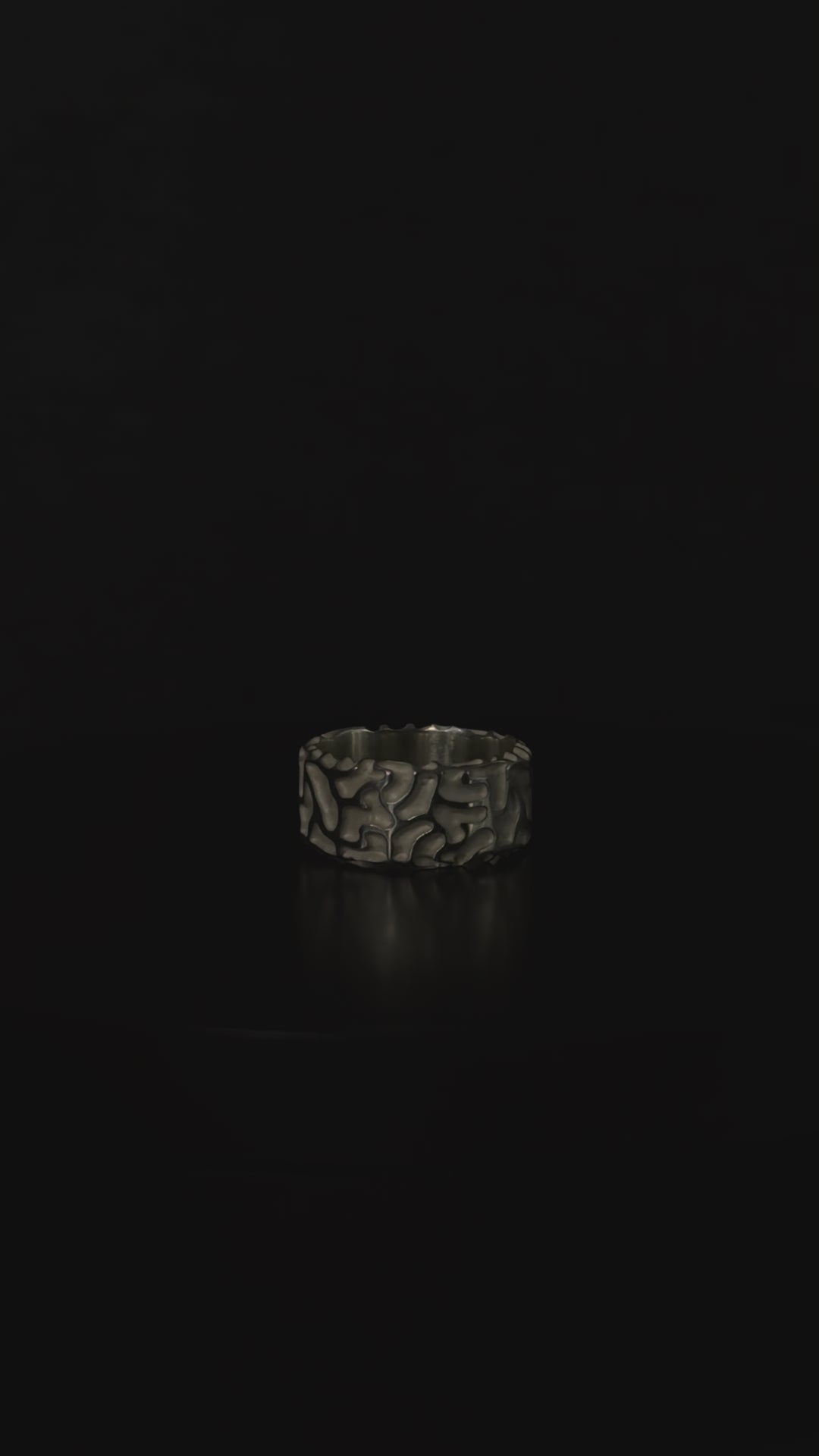 Fond satiné et surface organique polie. Contraste impressionnant pour une pièce pourtant faite d'argent massif. Version plus large (11mm).